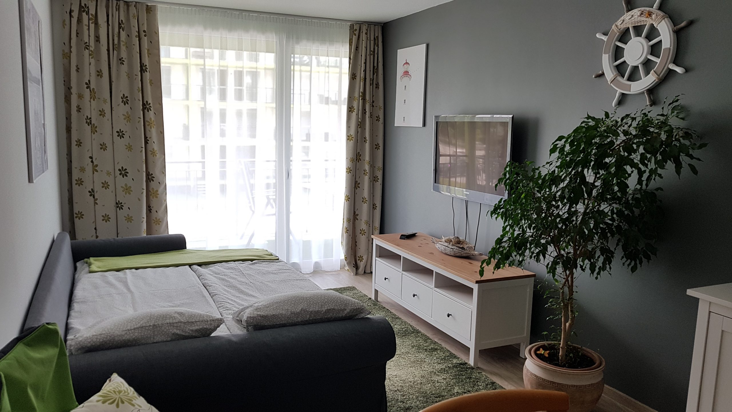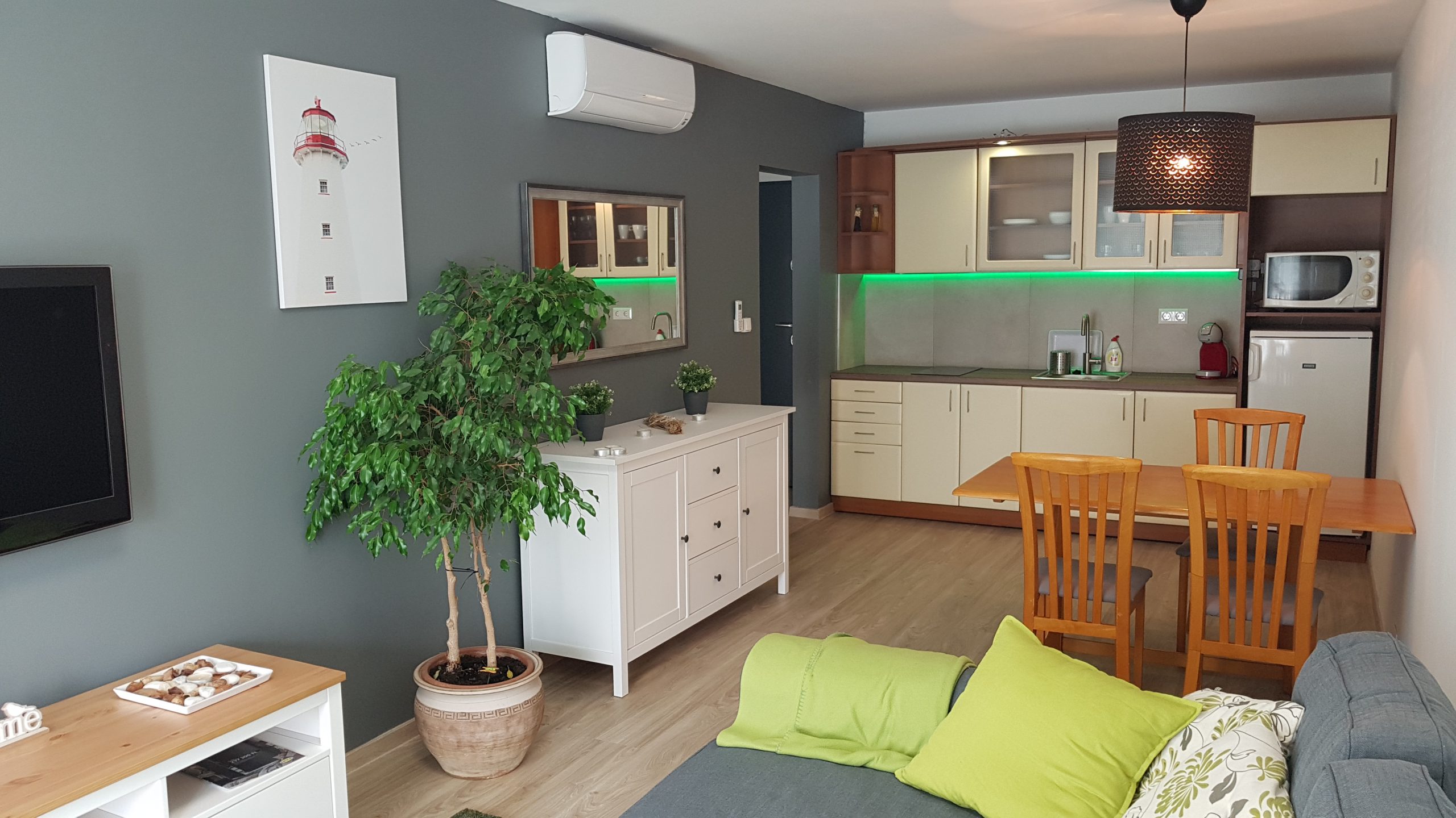 Nappali: 2 személyes, kényelmes rugós matracos kanapéágy (IKEA, 140 x 200 cm), síkképernyős televízió, közvetlen erkély kapcsolat kilátással a Balatonra.