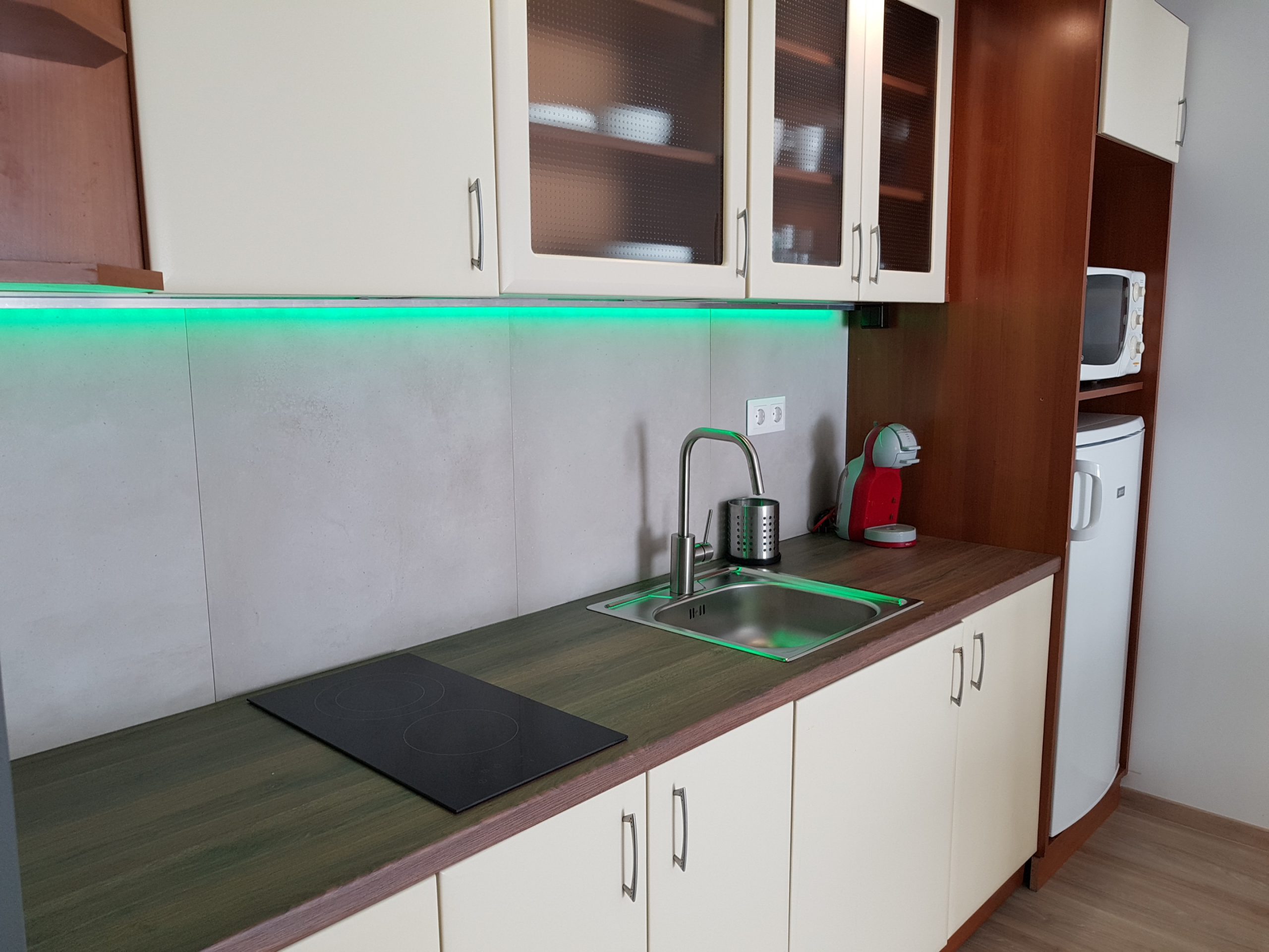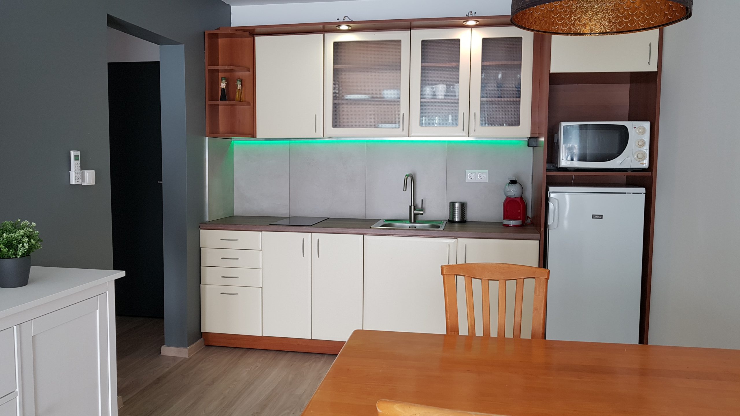 Kitchen-dining room: well equipped kitchen, ceramic cooking plate, refrigerator (with freezer), microwave oven, coffee machine (works with Dolce Gusto capsules), fully kitchen equipment.